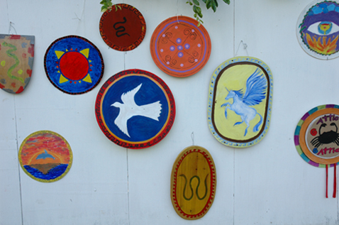 Art activities included visual expression of themes such as love, friendship, strength, and peace in order to unlearn and overcome competitive and aggressive attitudes and meet the children's universal needs for safety and acceptance. The children also created a model city-state by drawing people, houses, trees, and animals and after cutting them out placing them on large pieces of paper with the name of their city-state, such as Knossos, Thebes, Sparta, Athens, etc. The children also made city-state banners with the symbols of their city. These banners were then painted on cloth and carried onto the field during the Festival games.