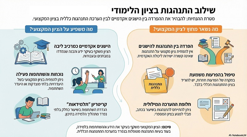 בבואנו ליישם הערכה בטווחים, עלינו לדייק את הקשר שבין התנהגות התלמיד לבין הערכת הישגיו. כדי שההערכה תהיה מהימנה ותשקף "תמונת בריאות" לימודית אמיתית, עלינו לשמור על הפרדה ברורה בין שני צירים מרכזיים: הציר המקצועי-אקדמי וציר ההתנהגות הכללי.